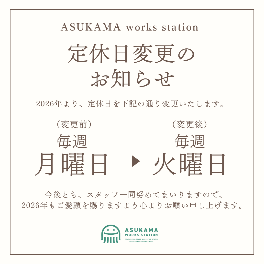 2026年より、D-HORIZON 天草支社、ASUKAMA works stationの定休日を下記の通り変更いたします。